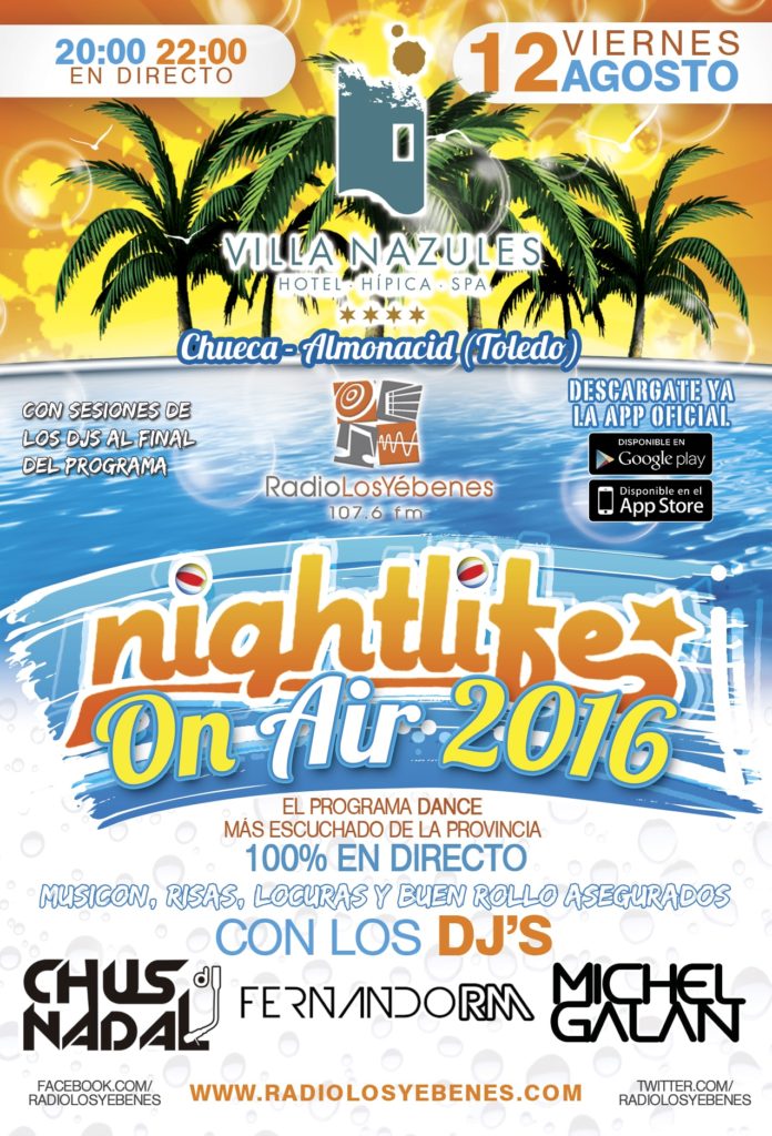Emisión en directo de nuestro programa NIGHTLIFE RADIO SHOW , como sabéis en verano nos desplazamos a distintos lugares para realizar el programa junto a mis compañeros Fernando RM y Michel Galán todo ello para haceros disfrutar de la radio en vivo, además nuestros OnAir son especiales porque después de la emisión… FIESTAZO!
